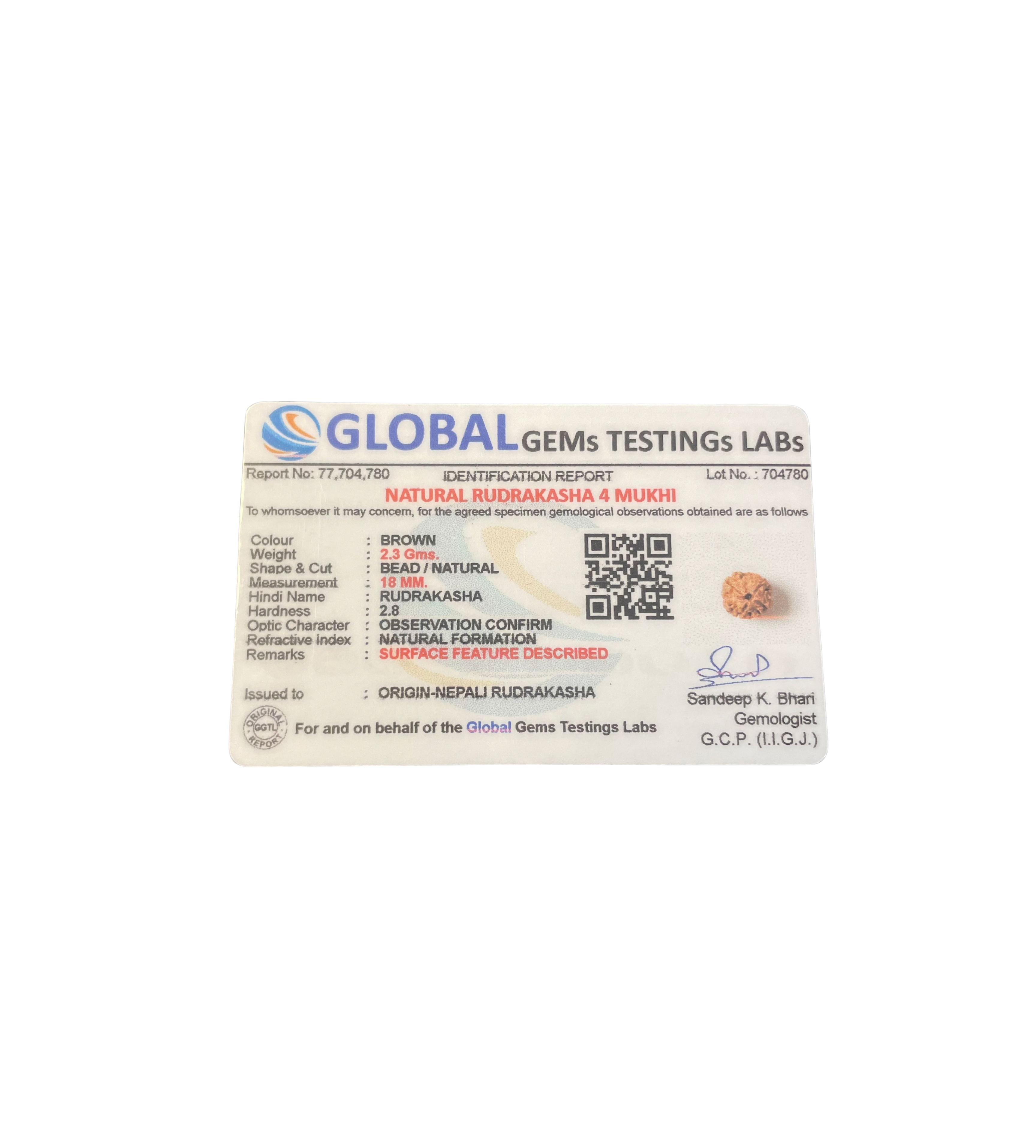 The 4 Mukhi Nepali Rudraksha Bead is a sacred and powerful Rudraksha associated with Lord Brahma, the creator and deity of knowledge, intellect, and wisdom. This original Nepali Rudraksha naturally features four distinct mukhi (faces) and is highly valued for enhancing mental clarity and communication skills.