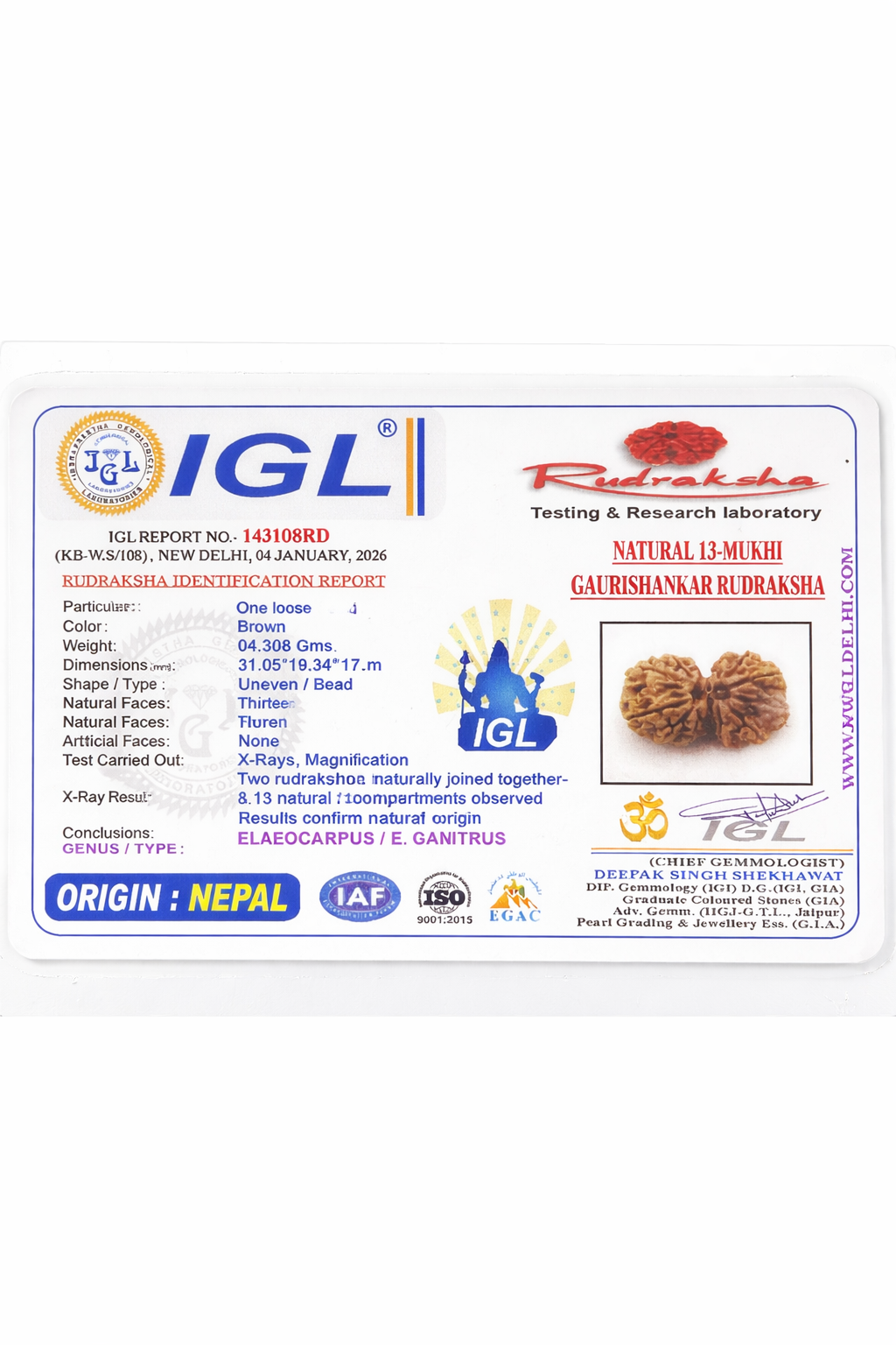 Each bead is 100% natural, unpolished, and comes with IGL laboratory certification, ensuring authenticity and purity. Gauri Shankar Rudraksha is highly revered for enhancing love, marital harmony, peace, and spiritual growth.